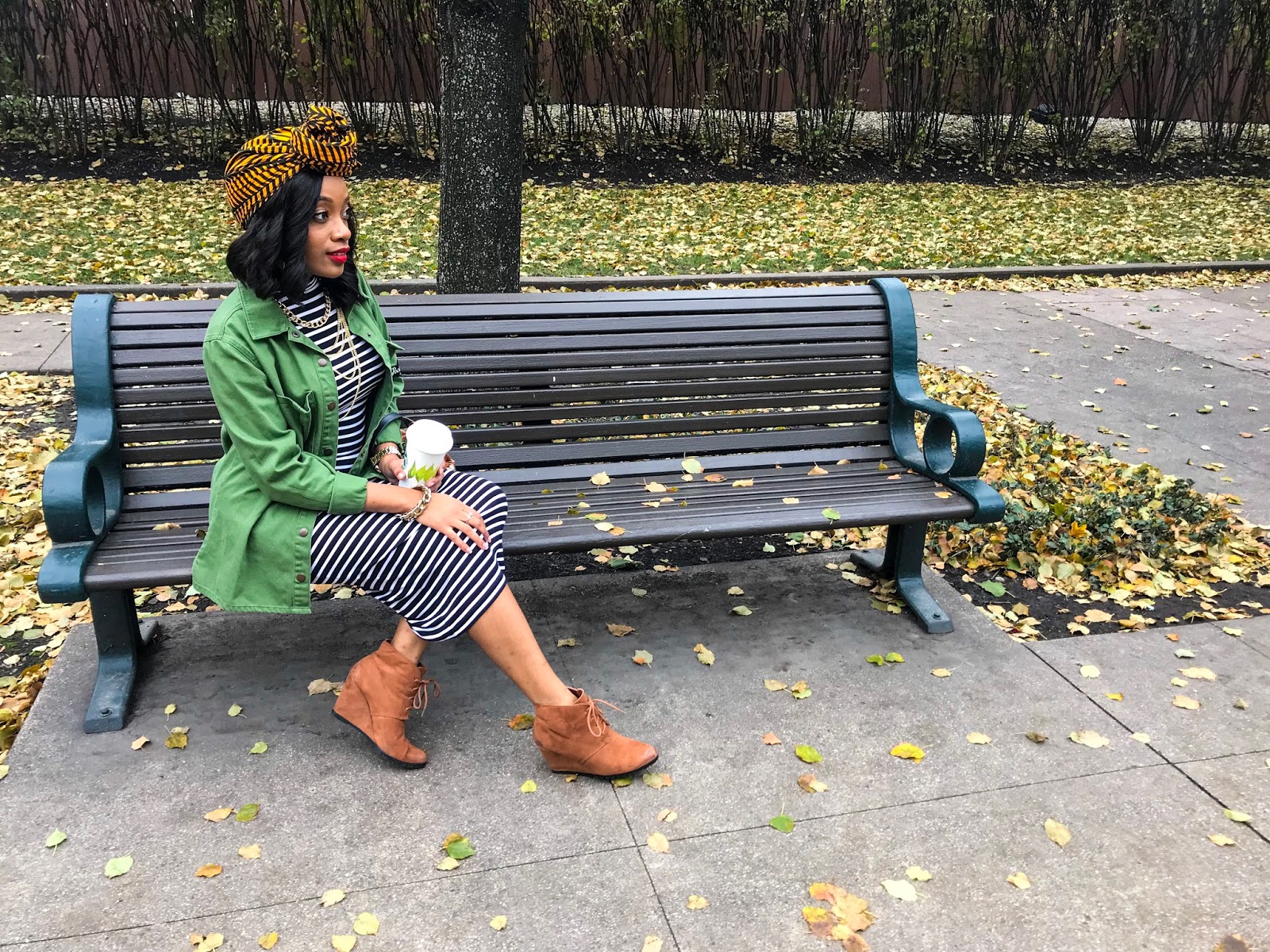 This is a great fall brunch outfit! The burnt orange jacket, combined with the brown shoes and orange head-wrap really drive home the warm, fall vibe. The orange pea coat is almost a show stealer but it plays well with the orange and black head wrap. The stripes in the dress and wrap play off of each other nicely, giving a subtle, mixing prints look. Jacket: Nordstrom
